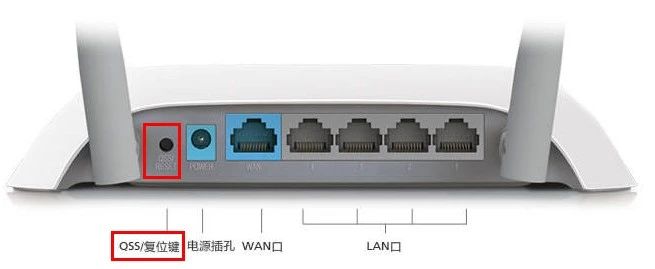 找到无线路由器后面的RESET按钮,一般此操作有两种,一种是直接能按住的按钮,一种是小孔,需要使用牙签会针孔顶住不动五秒。如下图: