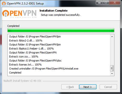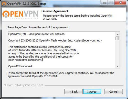 2、安装OpenVPN,NETGEAR的VPN服务功能是基于OpenVPN的技术实现的,因此,我们要在每一台需要连接VPN的电脑上安装部署OpenVPN软件。访问http://support.netgear.cn/doucument/Detail.asp?id=2251获取适用于您的操作系统的OpenVPN软件,本例中获取的软件安装包为“openvpn-install-2.3.2-I001-i686.exe”。双击运行此安装程序,根据安装程序提示完成安装: