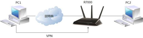 1、我们以上图的拓扑结构来说明此功能如何配置。待配置成功后,PC1可访问R7000无线路由器的内网资源。环境如下:
